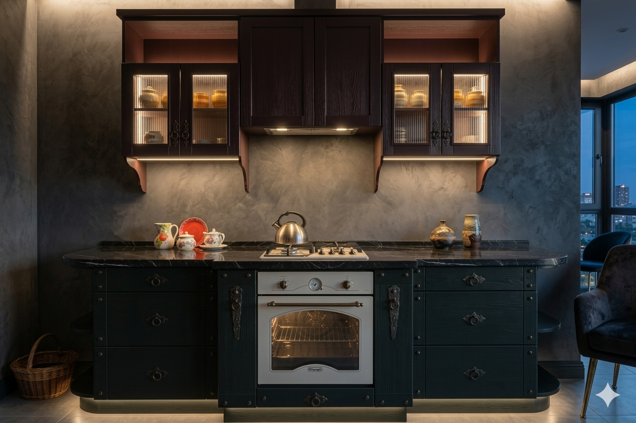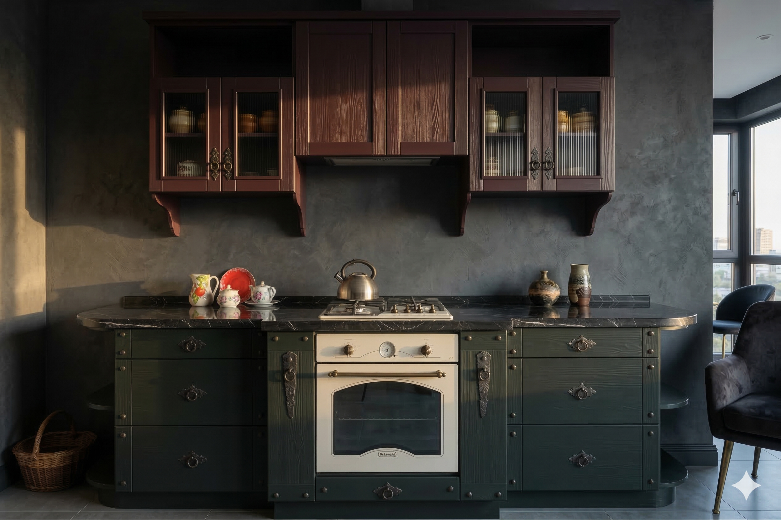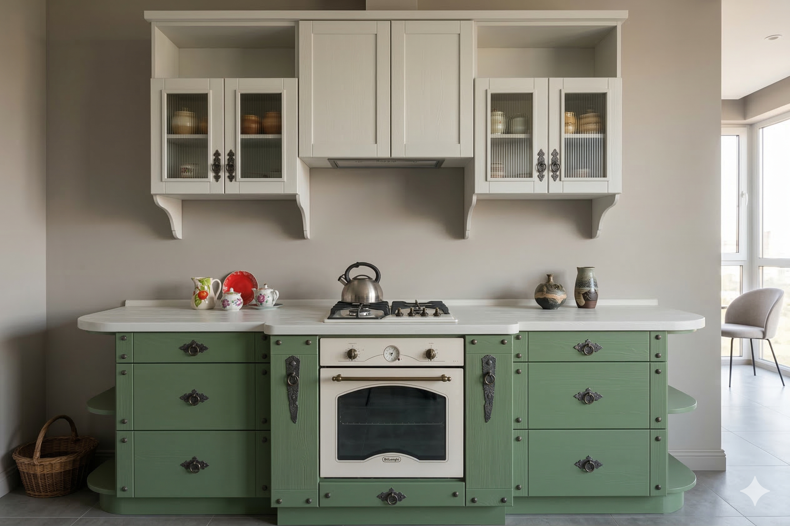 Отделка кухни в русском стиле хорошо адаптируется в ретро-интерьерах кантри, рустик, скандинавский, шале. Эмалевые филёнки фасадов, массивный стол и «ремесленные» деревянные стулья излучают домашний комфорт. Эффектно смотрится сочетание цвета слоновой кости с тёмным деревом. Материал изделия, любые параметры дизайна, отделки и конструкции могут быть изменены по желанию покупателя.